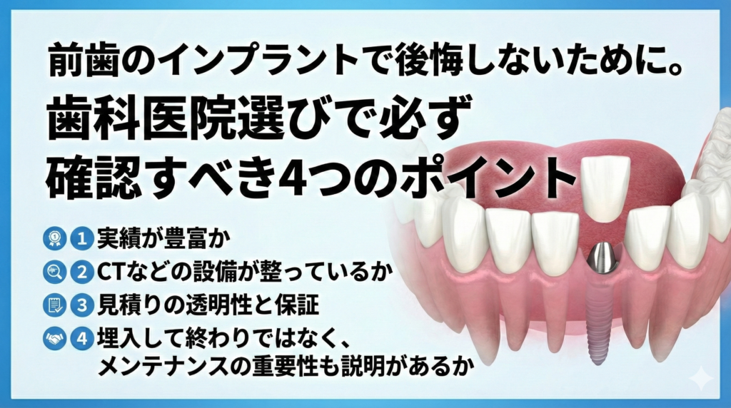 前歯は1~2mmの差が見た目に直結します。まずはCTで骨の高さ・幅・厚み、神経・血管の位置を立体的に把握できる医院を選びましょう。