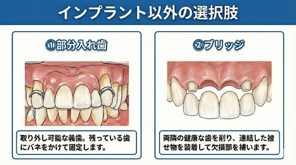 「部分入れ歯」と「ブリッジ」という二つの有力な選択肢のメリット、デメリットを解説します。